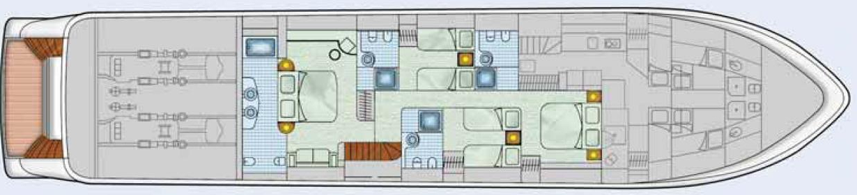 Von seiner geschmeidigen Außenhülle bis zu seinen „inneren Werten“, den MTU-Zwillingsmotoren, die diese sportliche Motorjacht auf 27 Knoten beschleunigen, ist dieses Boot sowohl stilistisch wie auch technisch ein wahres Meisterwerk.