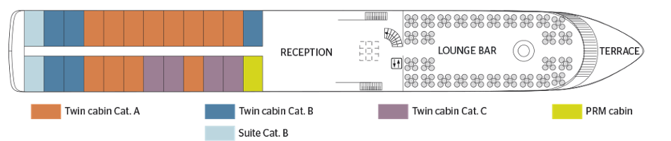 The decoration of the boat is a tribute to; Amalia Rodrigues, queen of Fado, renowned actress and ambassador of Portugal. The tone is set; with the terracotta color, enveloping and sunny, reminiscent of the colors of the streets of Lisbon and the accessories of fado singers. Blond woods and rattans are reminiscent of guitars and distill the warm spirit of the South into the boat. Built in 2018 and inaugurated in 2019, this 5-anchor category boat offers large spaces in the cabins and in the common areas. Large bay windows on the upper and middle decks allow you to appreciate the landscape during navigation. 4 suites are spread over these two decks, 2 of them located on the upper deck have a private terrace with deckchairs. Located on the main deck, the restaurant is where; all meals are served during the cruise. The lounge / bar is located to forward of the intermediate deck and will welcome passengers during lively evenings, aperitif games. A cozy terrace at; the front will allow you to have a drink outside. outdoors enjoying the scenery. On the sun deck, swimming pool and deckchairs will promote relaxation and relaxation for all.