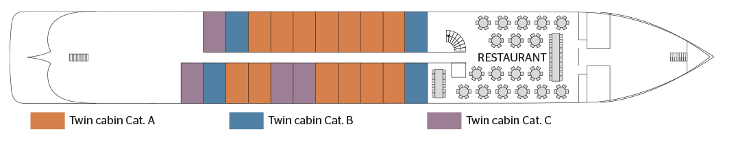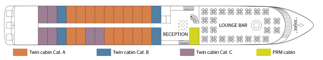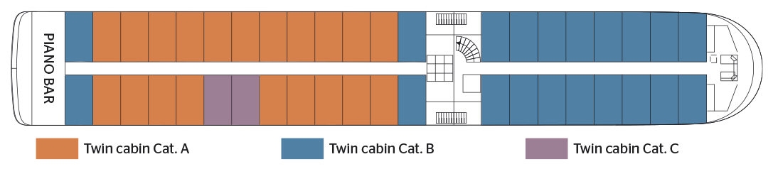 Baptized in honor of the famous German virtuoso, the Beethoven sails on the Rhine and on the Danube. It takes cruise passengers to the meeting of the many wonders offered by these two romantic rivers par excellence. Completely refurbished in 2010, the MS Beethoven is a 4-anchor boat. human dimension, measuring 110 meters long and 11 meters wide. It can accommodate 180 passengers, in 90 cabins arranged on three decks. Each of them, with an area varying from 11.50 to 1000 square feet. 13 m2, has all the amenities and offers the best living conditions. The decoration is neat and its atmosphere, both elegant and friendly, is in perfect harmony with its environment. Located at main deck level, the restaurant, where are served all meals during the trip, offers delicate cuisine in a refined setting, where; large bay windows allow you to take full advantage of the panorama. On the middle deck is the lounge bar with a dance floor, while a piano bar welcomes cruise passengers on the upper deck, in an intimate and soothing atmosphere. On the sun deck, an ideal place to relax and admire the landscapes, passengers can have comfortable deckchairs, as well as a large shaded area.