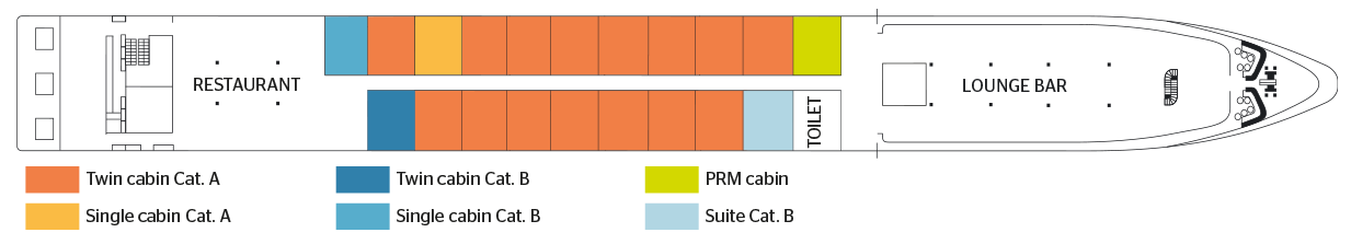 Inaugurated in 2015, she joined the category of 5-anchor boats by offering a very bright and spacious interior. The decoration is intended to be soothing with its colors of sunsets made of soft pinks and oranges. The decor, natural and elegant, recalls the fauna and flora of the Camargue. The 2 main common areas are located on the upper deck. At the front, the lounge / bar, at the front; behind the restaurant where all meals will be served during the cruise. The upper deck cabins have open balconies; the French and those on the main deck have large windows. Don’t hesitate to go to the sun deck to relax! It is laid out comfortable armchairs and deckchairs allowing you to relax while enjoying a panoramic view of the landscapes.
