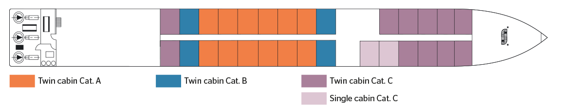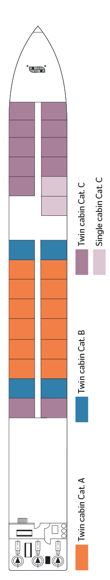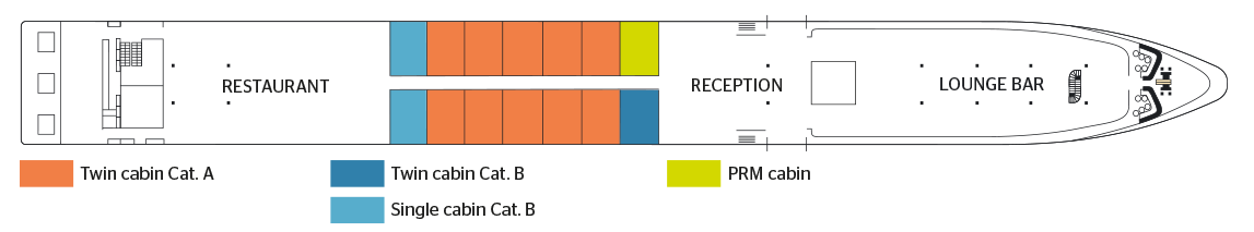 A great figure in the history of France and hero of the American War of Independence, the Marquis de Lafayette gave his name at this superb 5-anchor boat which sails on the Rhine. Completely refurbished in 2014, the MS Lafayette is a 5-anchor boat; human dimension, measuring 90 meters long and 10 meters wide. It can accommodate 82 passengers, in 43 double or single cabins, arranged on two decks. Each of them, with an area varying from 10 to 100 m². of 15 m2, has all the amenities and offers the best living conditions. The interior, very contemporary, with both sober and sparkling has been realized in gray and sand tones, married to; purple and lilac accords. Located at the level of the upper deck, the restaurant, where are served all meals during the trip, offers delicate cuisine in a refined setting, where; large bay windows allow you to take full advantage of the panorama. On this same deck is also the lounge bar with dance floor and central bar, while on the sun deck, an ideal place to relax and admire the landscapes, passengers can have comfortable deckchairs , as well as a large shaded area.