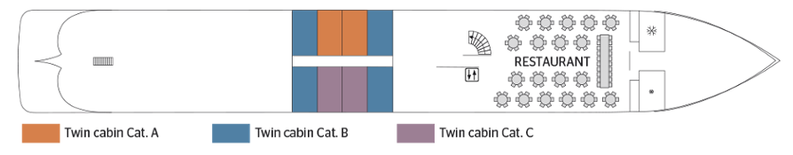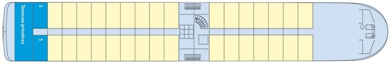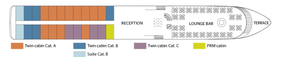 Built and inaugurated in 2017, this boat upgrades; honor the wines and architecture of Porto. The burgundy color, blond wood and black steel strapping are reminiscent of Port wine and its barrels. The riveted steel structures and the photos at receipt refer to the architecture of the Eiffel bridge which gives the heart of the city its special character. Large windows allow you to contemplate the landscapes from the restaurant or from your cabin. The restaurant is located to the front of the main deck and the lounge / bar at; the front of the middle deck. The cabins are spread over the 3 decks: on the middle deck and on the upper deck, they have open balconies; the French. A swimming pool adorns the sun deck, which has also been fitted out. of deckchairs.