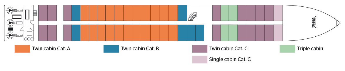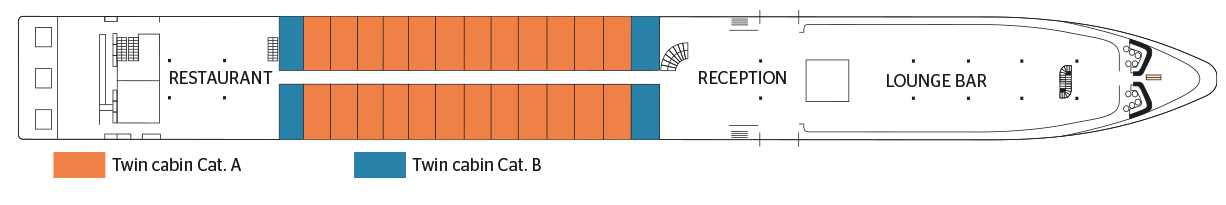 It’s one of the most illustrious impressionist painters, Claude Monet, who gave his name at this elegant boat, which sails on the Rhine and the Danube. It takes cruise passengers to the meeting of the many wonders offered by these two romantic rivers par excellence. The MS Monet is a 4 anchor boat. human dimension, measuring 110 meters long and 11.40 meters wide. It can accommodate 158 passengers, in 78 cabins arranged on two decks. Each of the cabins, with an area of ​​11.50 m2 (10 m2 for the single cabin), has all the amenities and offers the best living conditions. The decoration is neat and its atmosphere, both elegant and friendly, is in perfect harmony with its environment. Located at the level of the upper deck, the restaurant, where are served all meals during the trip, offers delicate cuisine in a refined setting, where; large bay windows allow you to take full advantage of the panorama. À this same level also houses the lounge bar with a dance floor, while on the sun deck, an ideal place to relax and admire the landscapes, passengers can have comfortable deckchairs, as well as sun loungers. a large shaded area.