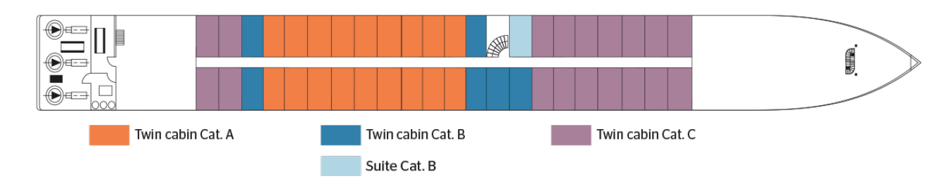 The MS Rhone Princess sails on the Rhône and the Saône, from Burgundy to France. Provence, between natural splendours, cultural riches and gourmet delights, in the heart of landscapes that are among the most beautiful and best preserved in France. The MS Rhone Princess is a 4-anchor boat. human dimension, measuring 110 meters long and 11.40 meters wide. It can accommodate 138 passengers, in 69 cabins arranged on two decks. Each of them has all the amenities and offers the best living conditions. The orange and chocolate tones of the decoration, as well as the woodwork and the golden ceilings, offer an authentic, warm and welcoming atmosphere. Located at the level of the upper deck, the restaurant, where are served all meals during the trip, offers delicate cuisine in a refined setting, where large bay windows allow you to take full advantage of the panorama. On this same deck is also the lounge bar with dance floor, while on the sun deck, an ideal place to relax and admire the landscapes, passengers can have comfortable deckchairs, as well as a large shaded area.