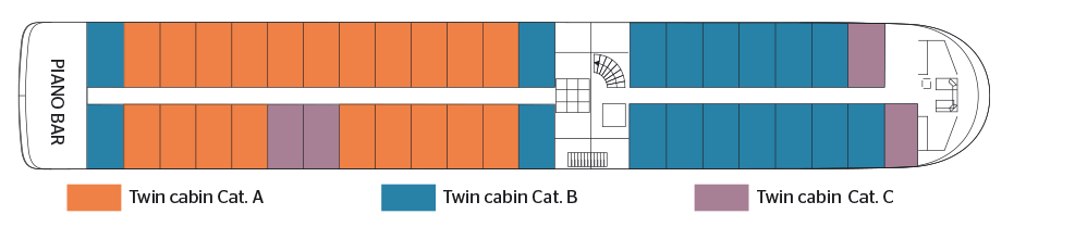 It bears the name of one of the greatest virtuosos in the history of music, who notably composed « The Four Seasons ». The MS Vivaldi sails on the Danube, at the meeting of the many wonders offered by this romantic river par excellence. The MS Vivaldi is a superb 5 anchor boat. human dimension, measuring 110 meters long and 11.40 meters wide. It can accommodate 176 passengers, in 88 cabins arranged on three decks. Each of them, with an area ranging from 9 to 100 square meters. 13 m2, has all the amenities and offers the best living conditions. The decoration is neat and its atmosphere, both elegant and convivial, rich as a Vivaldi concerto, is in perfect harmony with its environment. Located at the level of the intermediate deck, the restaurant, where are served all meals during the trip, offers delicate cuisine in a refined setting, where; large bay windows allow you to take full advantage of the panorama. At the level of this same deck is the lounge bar with a dance floor, while a piano bar welcomes cruise passengers at the level of the upper deck, in an intimate and soothing atmosphere. On the sun deck, an ideal place to relax and admire the landscapes, passengers can have comfortable deckchairs, as well as a large shaded area.
