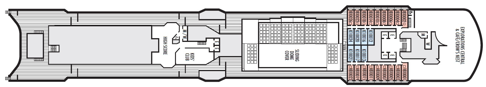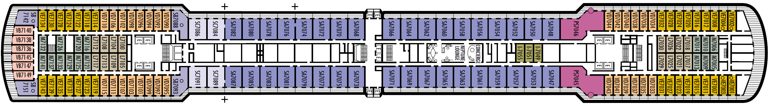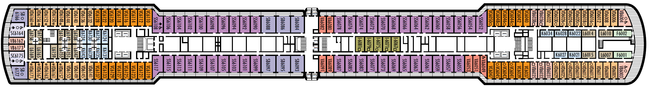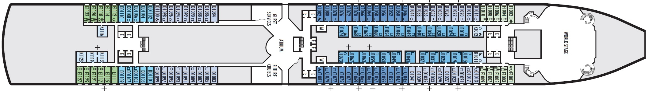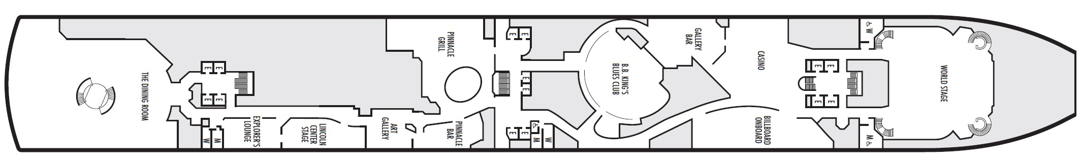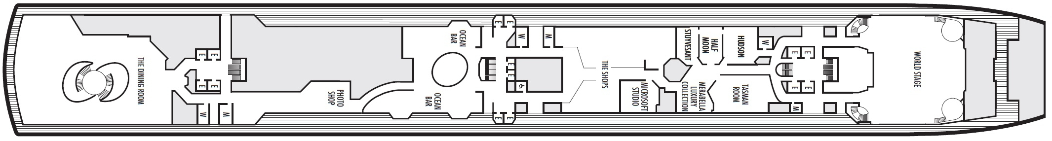 Das Zentrum der Oosterdam beeindruckt mit einem dreistöckigen Atrium und einem prunkvollen Kristallglobus. Das Schiff ist mit exquisiten Möbeln und sehr viel Kristall, Marmor, edlen Hölzern, Messing, Blumenarrangements, Kunstwerken und Antiquitäten eingerichtet