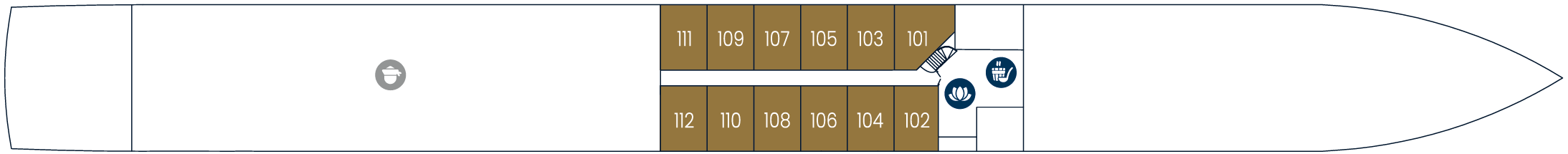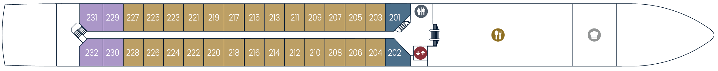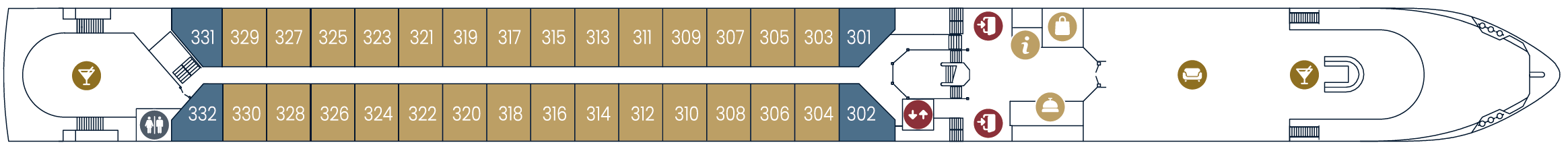 Op het Diamond deck treft u de stijlvolle lounge met panoramische bar en dansvloer, de comfortabele Bistro Bar met internetcorner achterin en de inkomhal met receptie en boetiek aan boord. Het elegante restaurant bevindt zich op het Ruby-dek. De wellness-ruimte met whirlpool, sauna, stoombad en solarium bevindt zich op het Emerald dek. Een andere whirlpool is op het zonnedek. De dekken zijn verbonden door een lift (niet naar het Emerald-dek). Het schip is volledig voorzien van airconditioning.